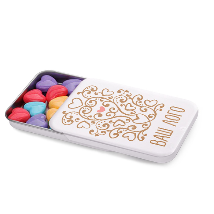 Разноцветные конфетки-сердечки – отличный корпоративный подарок для женщин. Они сладкие и в хорошей форме, а упакованы в стильный металлический кейс. Крышку кейса можно оформить в стиле Вашей корпоративной идентичности или, например, написать на неё стихи.