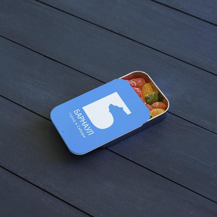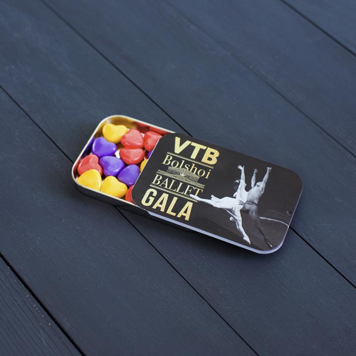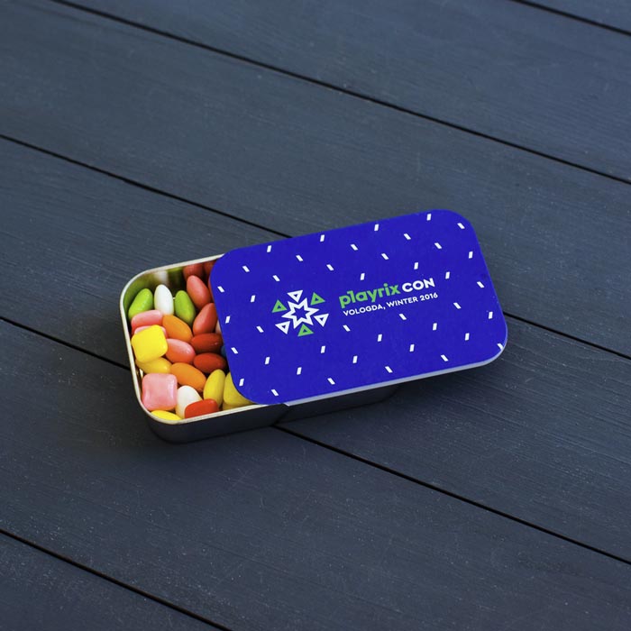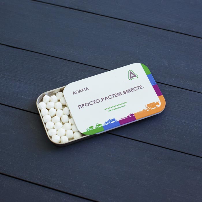 Металлическая коробочка заполненная мятными драже. Место под оформление находится на крышке – на небольшой площади хватит место под логотип, слоган и корпоративный образ.